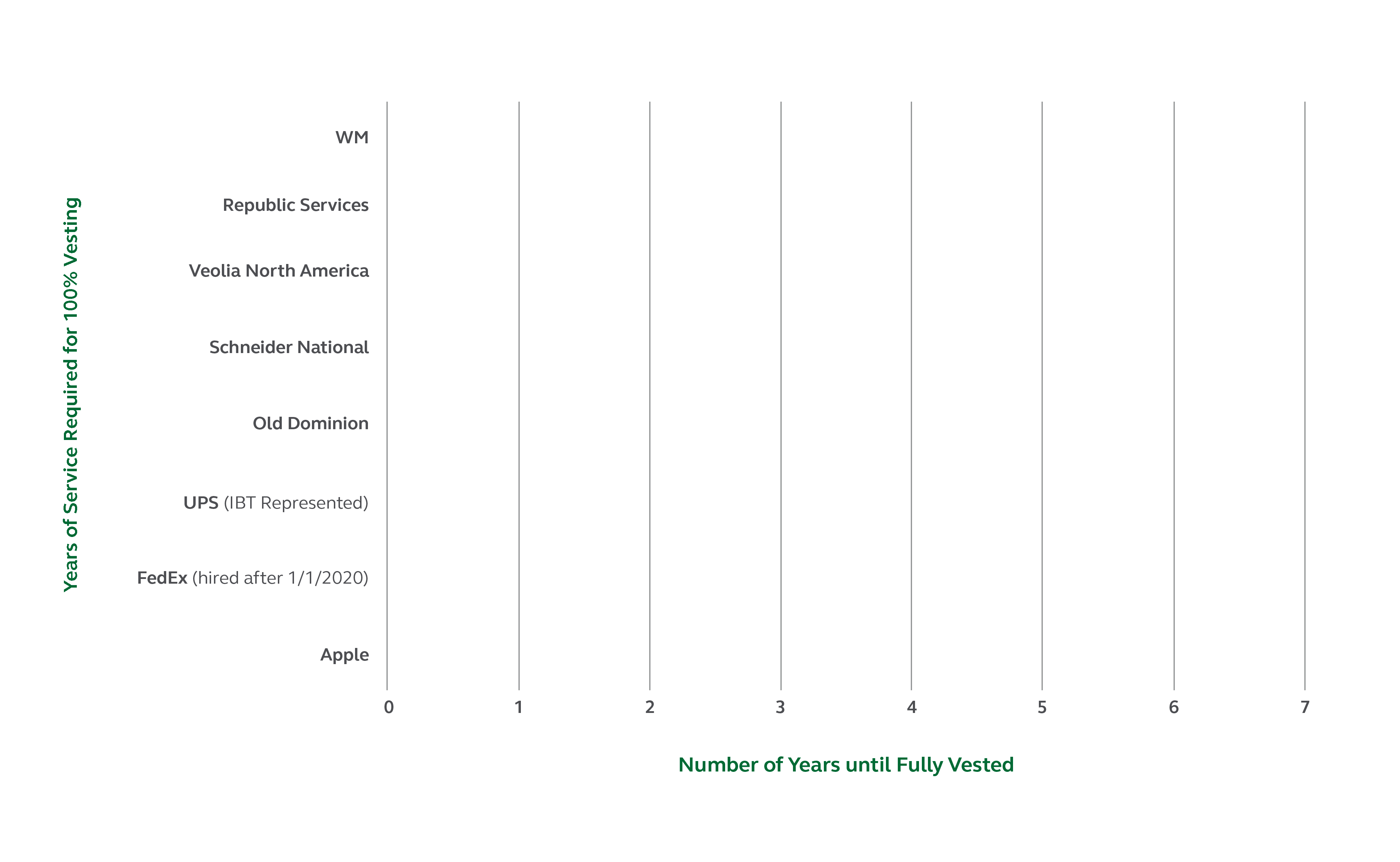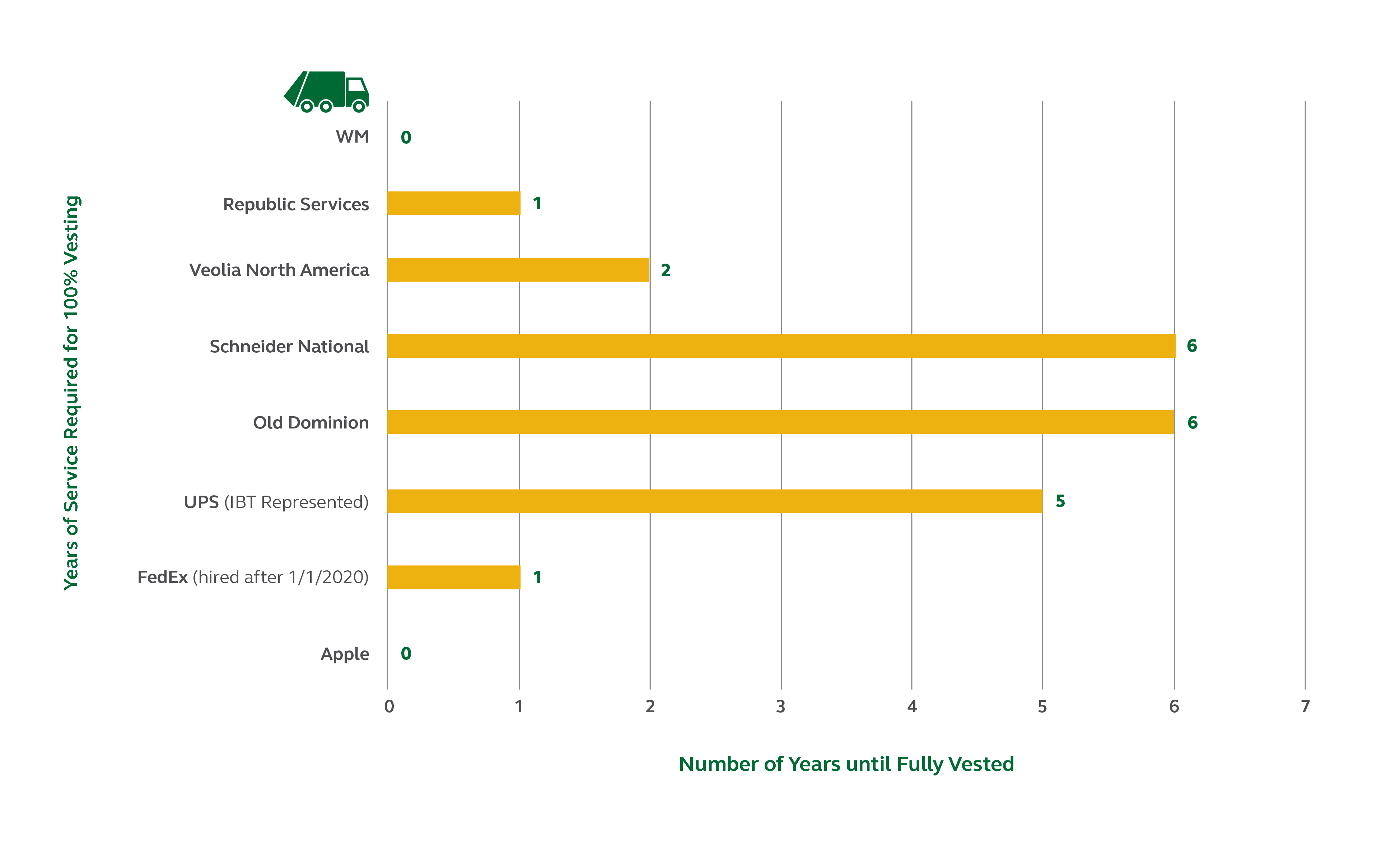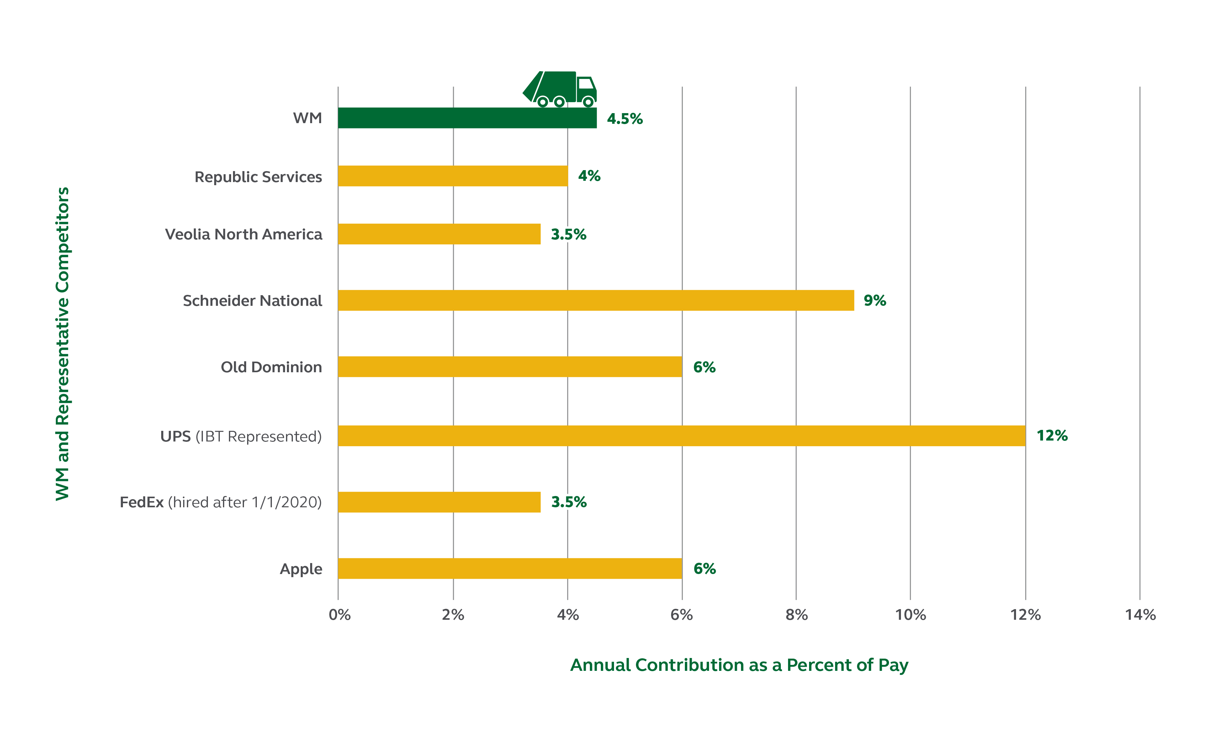 WM offers a generous benefits program to your team members, including contributions toward team member retirement plans. The graph below illustrates WM's maximum employer contribution to retirement as a percent of salary and how it compares to your competitors, both in your industry and in others who hire similar talent. (Information from most recent 5500 filings – 12/31/20)