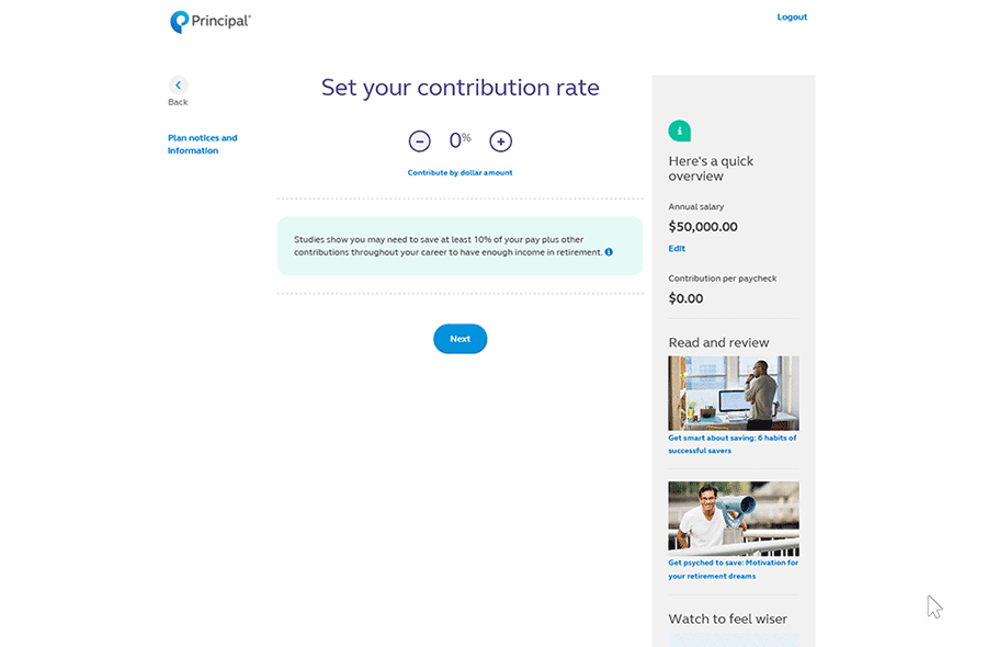 The experience includes educational messaging around starting off with saving 10% and information about starting small and building with an annual increase.